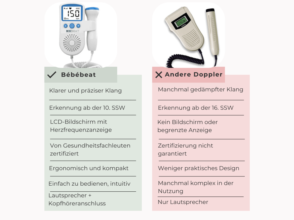 Woche den Herzschlag Ihres Babys hören können. Genießen Sie das regelmäßige Hören von zu Hause aus, ohne ins Krankenhaus fahren zu müssen, um sich zu beruhigen und jeden Moment Ihrer Schwangerschaft zu genießen, ohne dass der Stress dieses schöne Abenteuer trübt